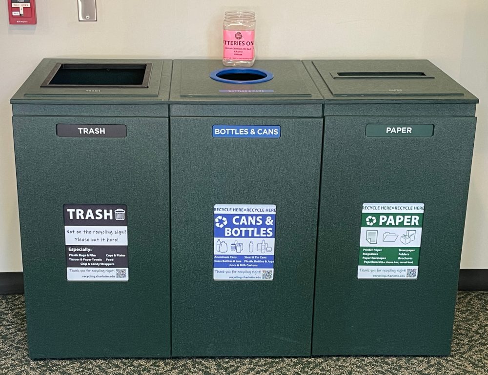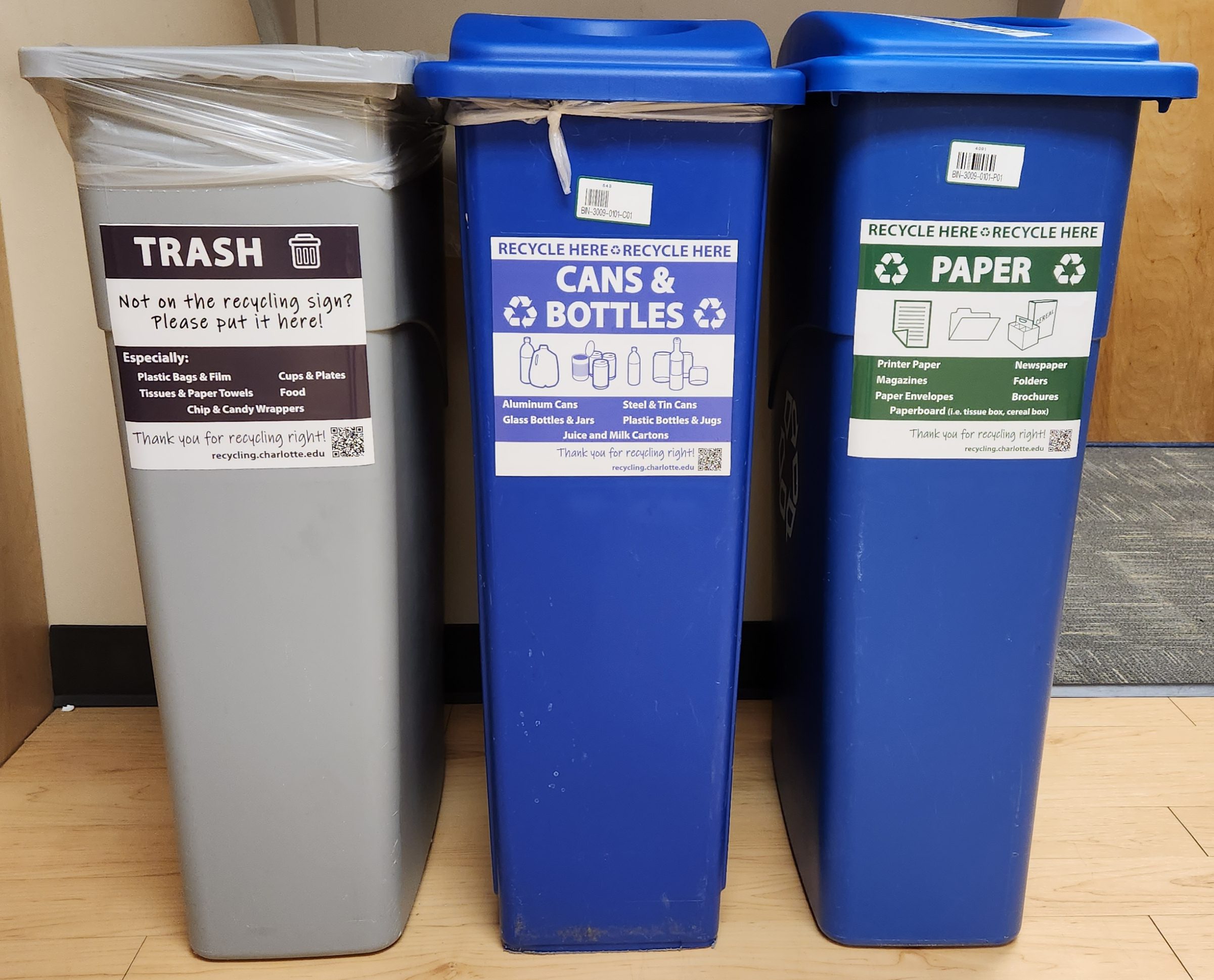 Public areas inside campus buildings are outfitted with recycling stations that collect three categories of waste: trash, cans & bottles, and paper. The university has standardized the signs at these stations.